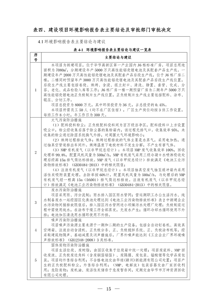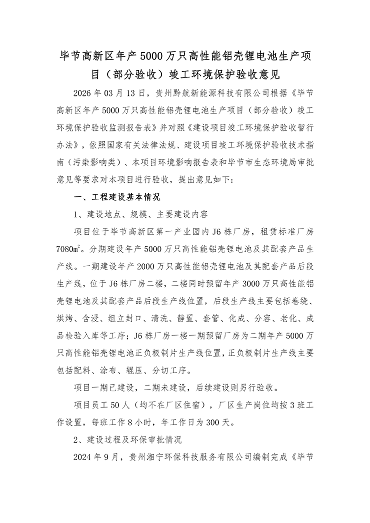 项目名称:毕节高新区年产5000万只高性能铝壳锂电池生产项目(部分验收)